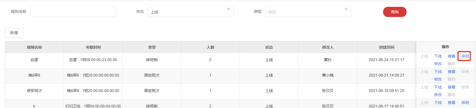2.于列表点击需要排班的考勤规则信息操作列的**排班**按钮