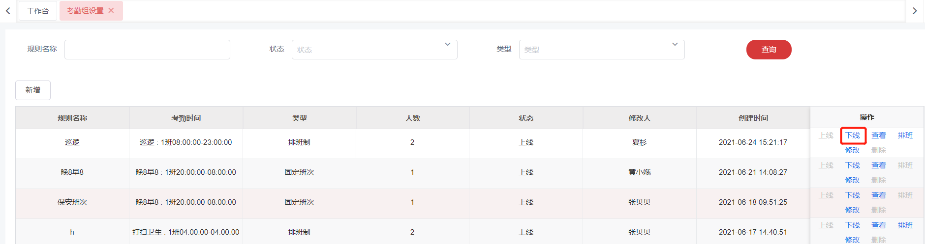 2.于列表点击需要下线的在考勤规则信息操作列的**下线**按钮
