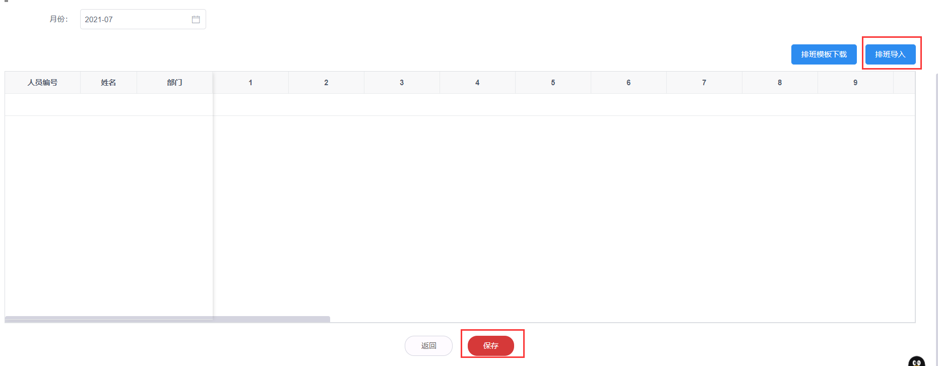 4.点击**排班导入**按钮,上传文件后点击**保存**按钮