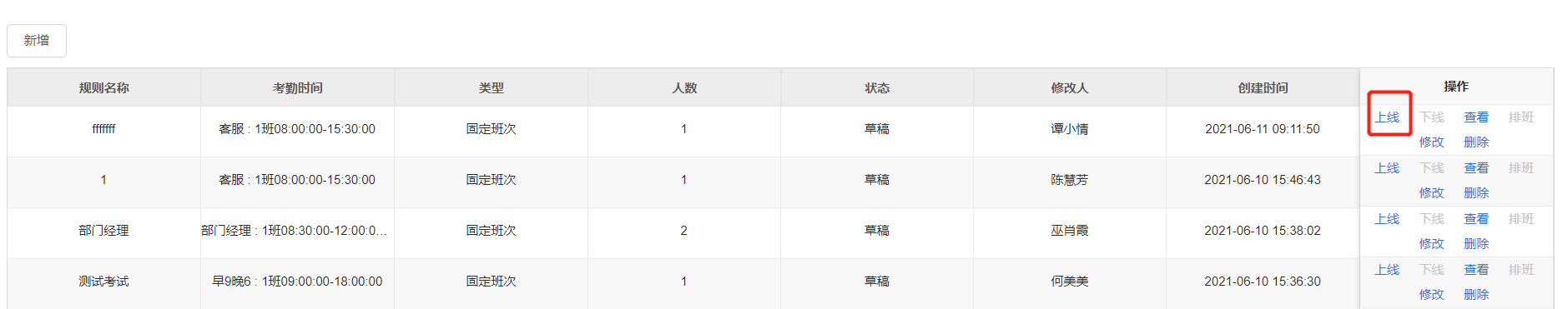 2.于列表点击需要上线的考勤规则信息操作列的**上线**按钮