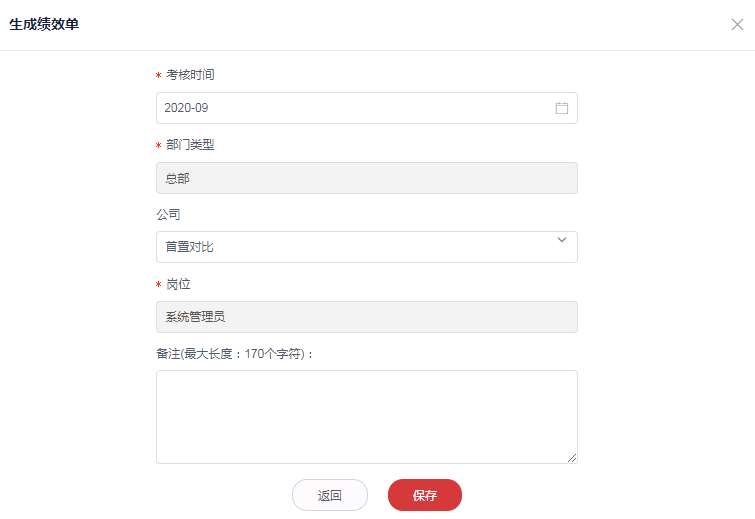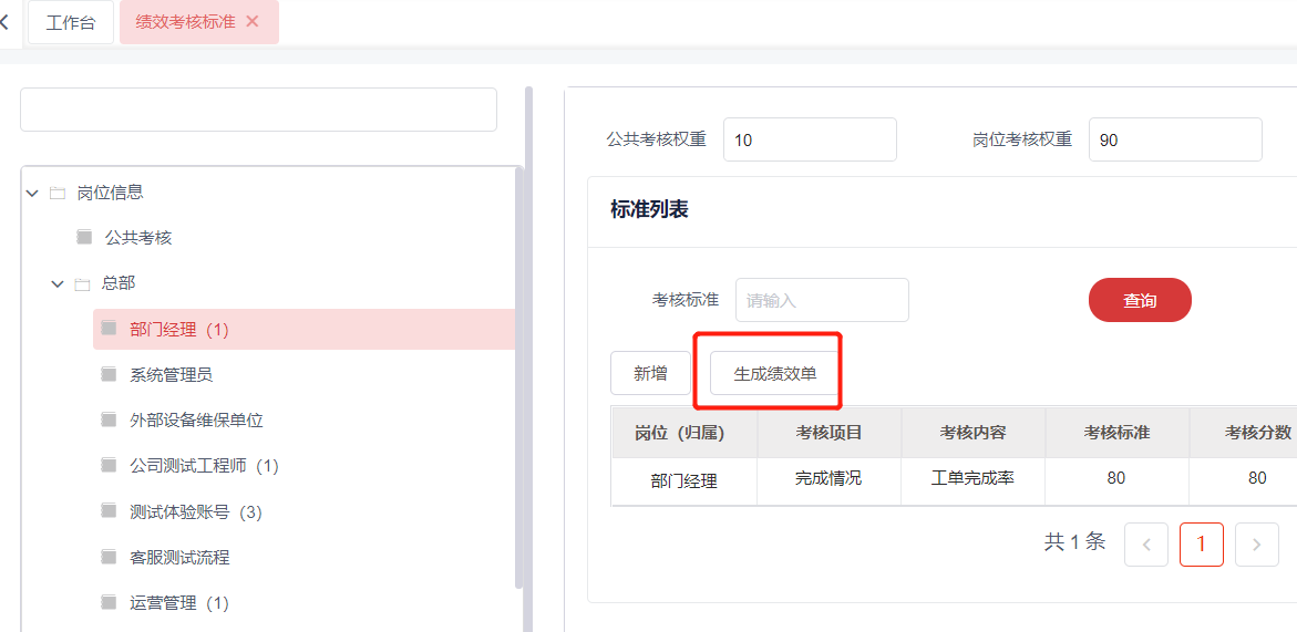 2.选中左侧需要生成绩效单的岗位后,点击右侧列表上方**生成绩效单**按钮
