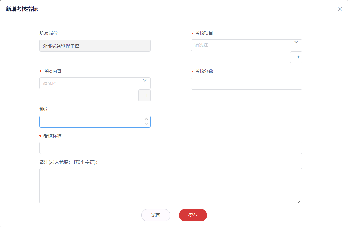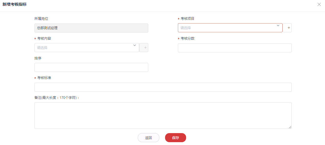 (说明:于上图新增页面点击考核项目后的"+"可添加考核项目,点击考核内容后的"+"可新增考核内容)