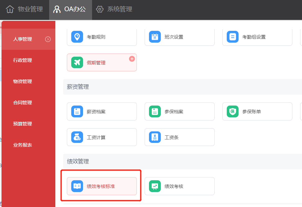 1.点击菜单:**OA办公 > 人事管理 > 绩效考核标准**