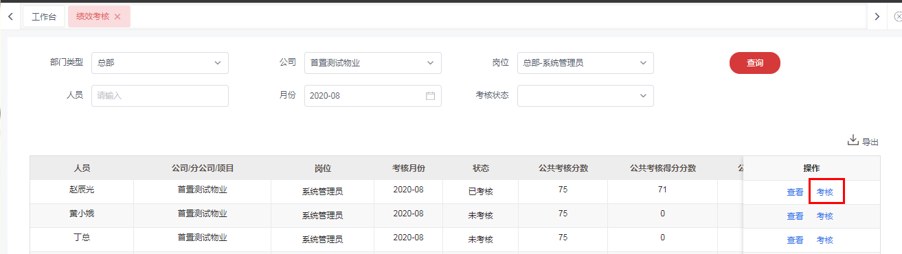 2.通过查询条件,查找出需要进行绩效考核的岗位,点击人员行上面的考核按钮。