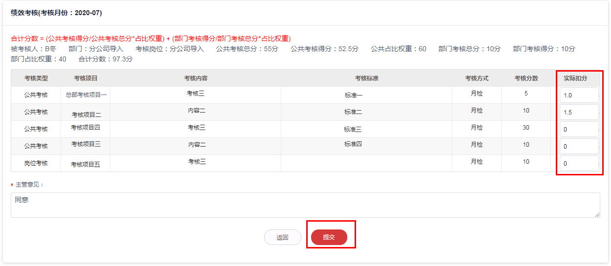 3.填写实际扣分数,并填入主管意见,点击提交。