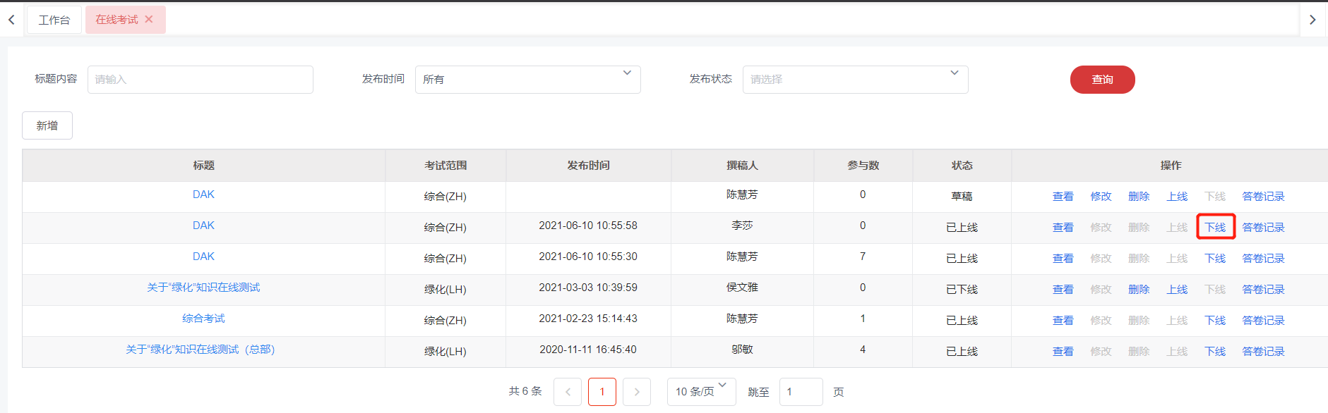 2.于列表点击需要下线的在线考试信息记录操作列的**下线**按钮