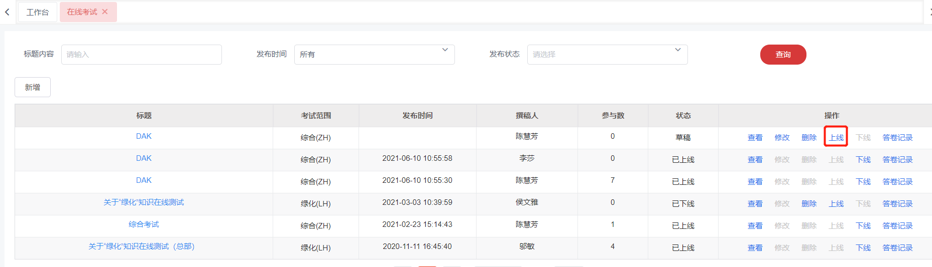 2.于列表点击需要上线的在线考试信息记录操作列的**上线**按钮