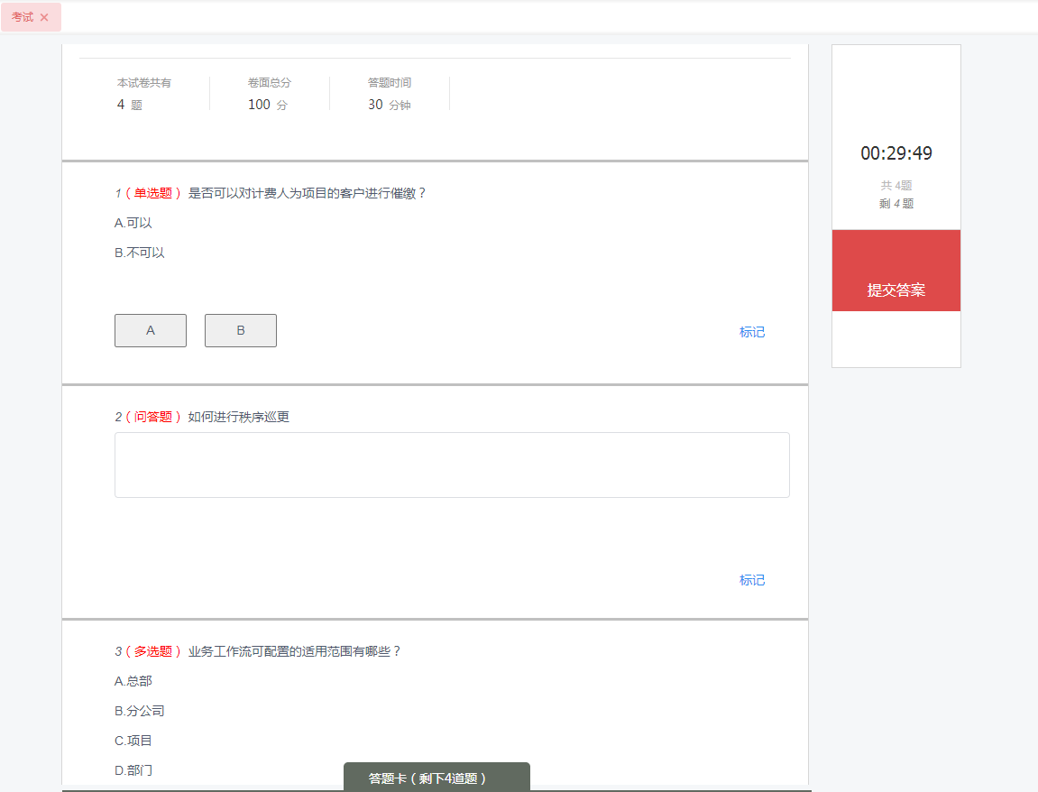 (说明:单选题、多选题会根据题目的正确答案自动计算得分,只有问答题需要手动填写得分)