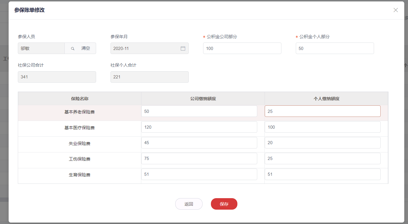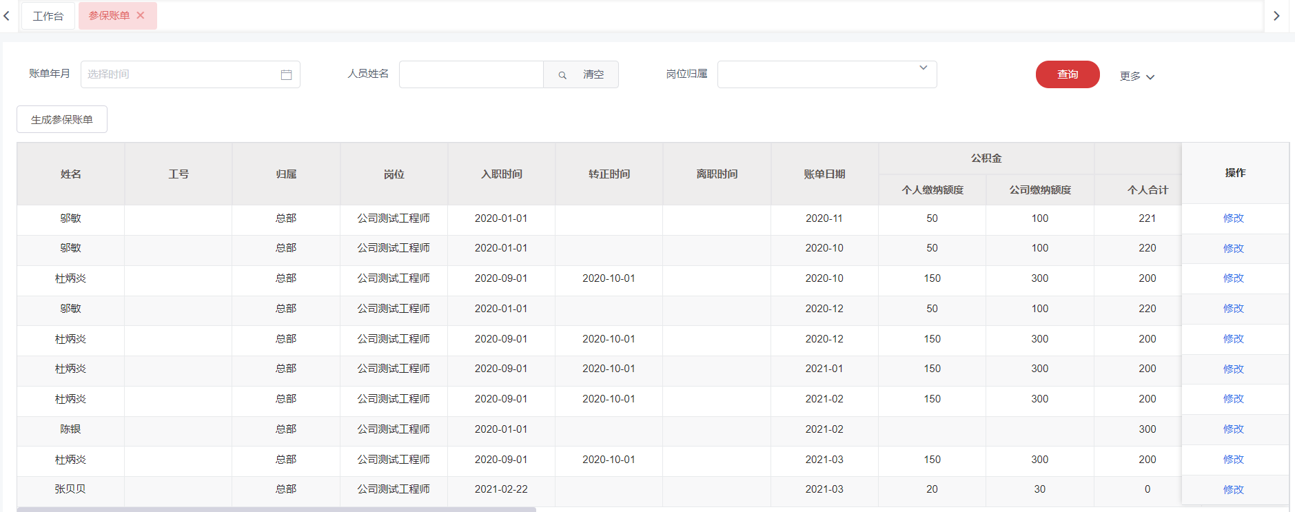 1.选择 **OA办公 > 人事管理 > 参保账单**,可在列表界面查看或修改。