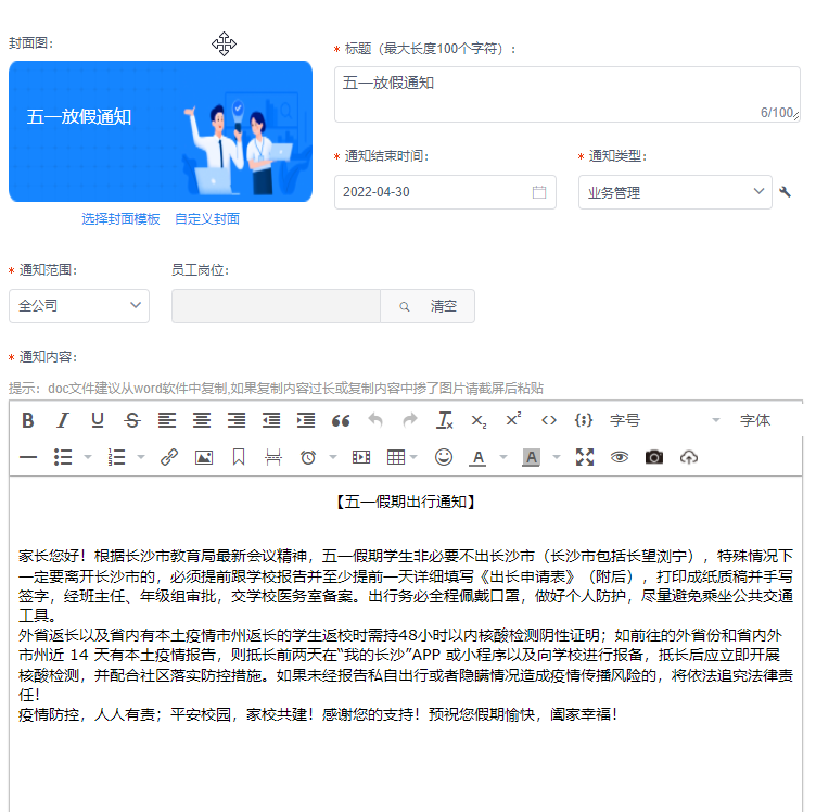 2. 录入通知信息,单击**保存**。