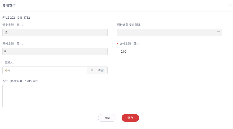 3.填写支付金额和领取人后点击**保存**。