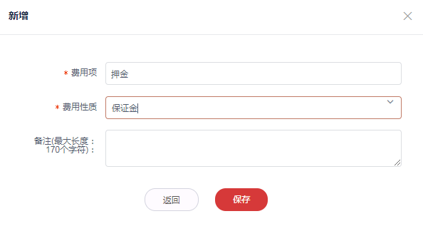 4.添加成功,于列表可查看到该费用项,并可于合同管理添加该费用项的费用信息。