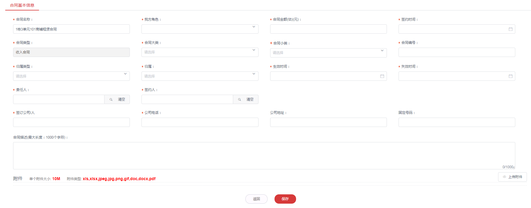 3.进入合同基本信息页签,填写合同基本信息,点击**保存**按钮。