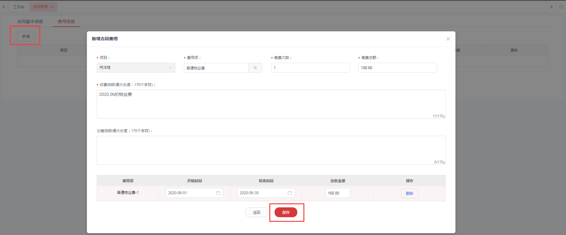 5.进入合同费用信息页签,填写合同费用信息,点击**保存**按钮。
