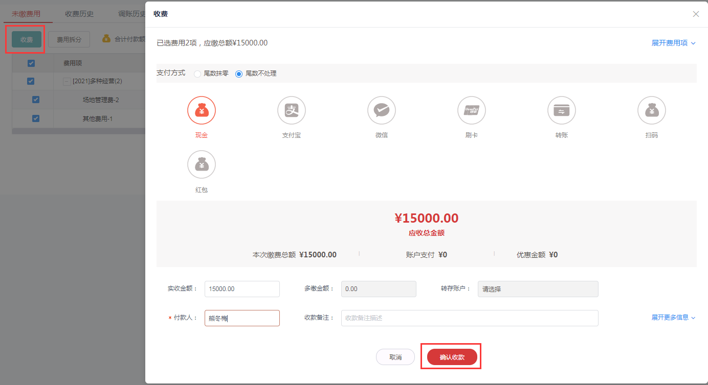 3.在未缴信息页面勾选费用项后点击**收费**按钮。
