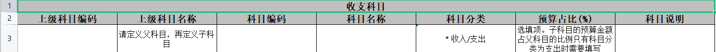 注:第3行为说明行,请不要录入。当同时导入父、子科目时,请先定义父科目,再定义子科目。