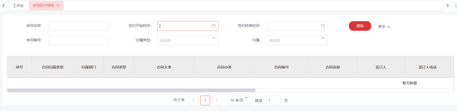 按照合同名称、签约时间、合同编号、归属类型、归属查询合同的基本信息及费用付款信息