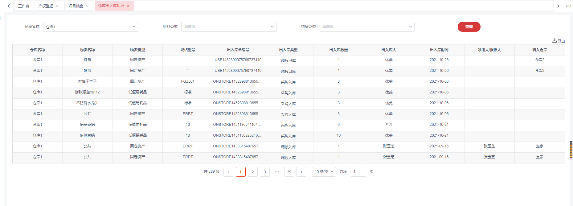 1. 选择**OA办公>业务报表>物资管理>仓库出入库明细** 。
