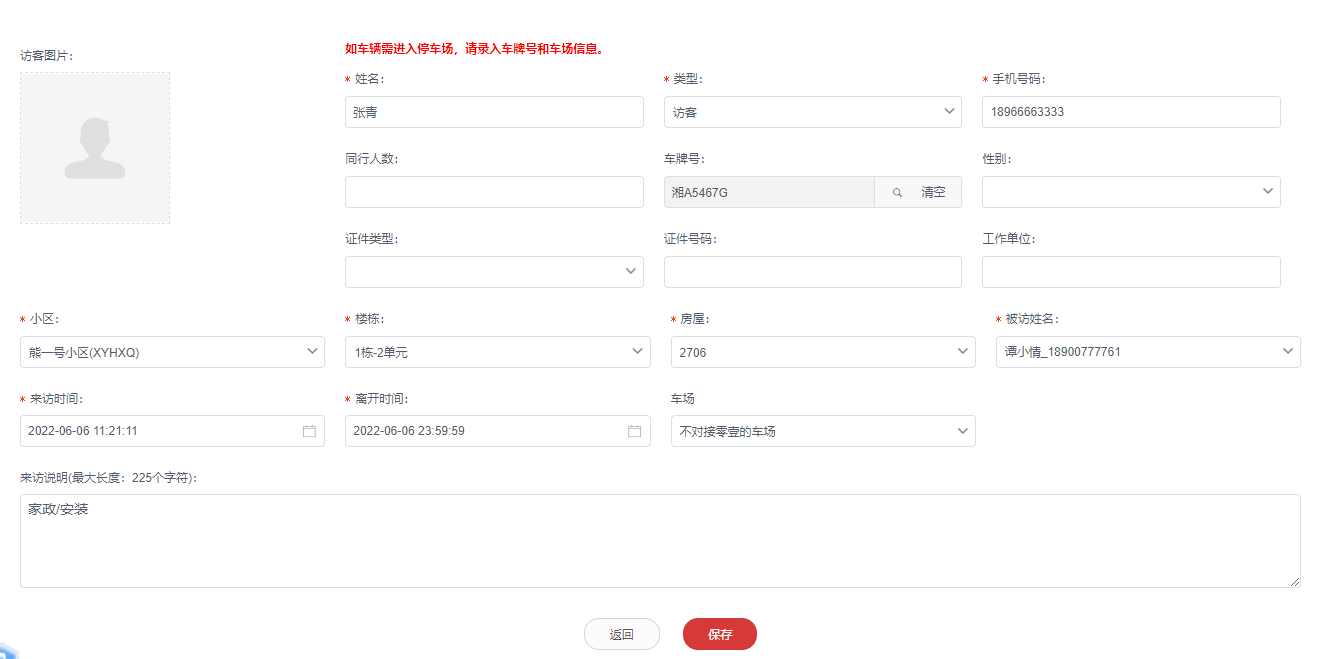4.选择被访房屋、被访姓名、来访时间、离开时间。不对接零壹车场,来访说明由手工输入。