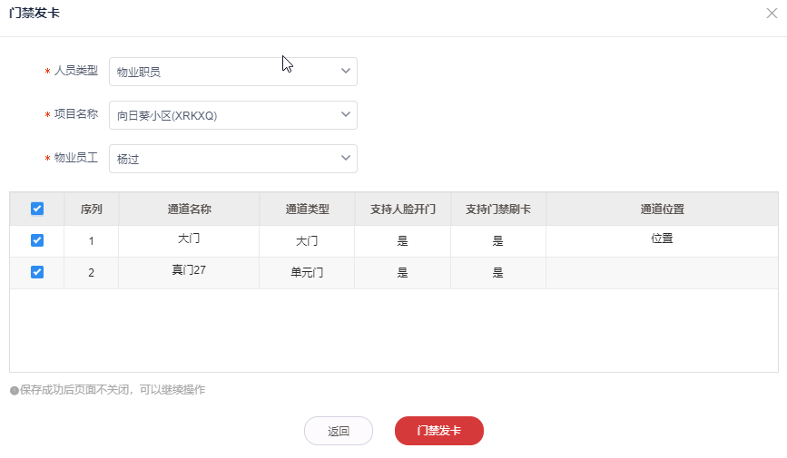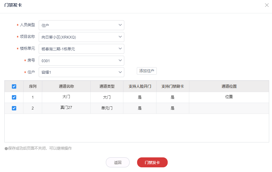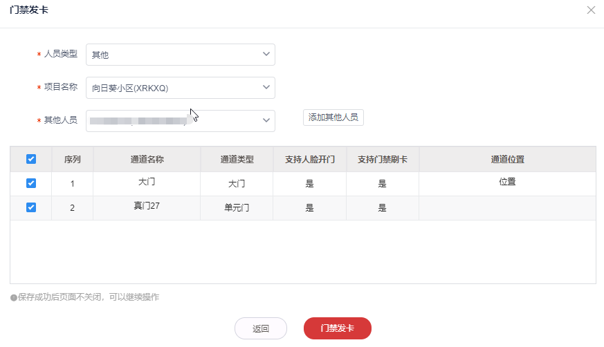 您可以指定的业主、物业员工或其他人员(例如租赁了车位的外来人员)进行门禁发卡。