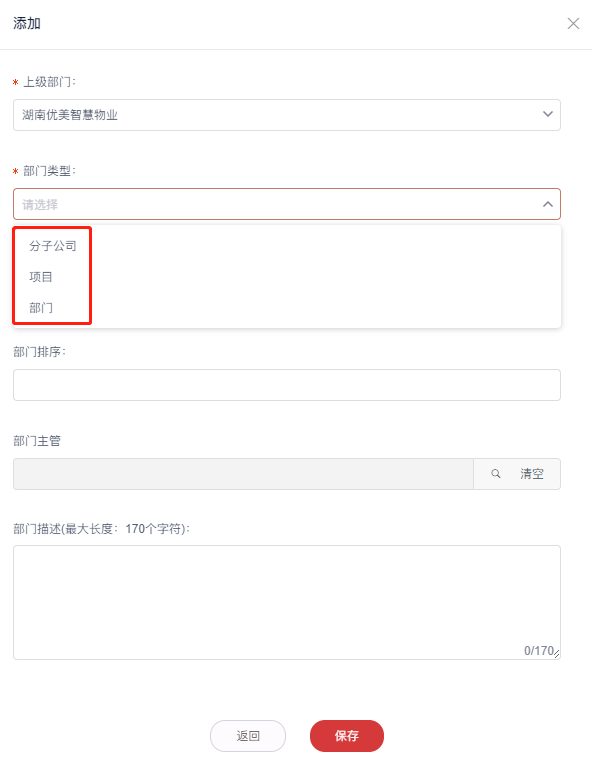 3.选择新增部门的部门类型(部门类型为项目时需选择关联的项目名称,部门类型为分子公司时需选择是否是独立运营分子公司),并正确填写其他部门信息后点击**保存**按钮