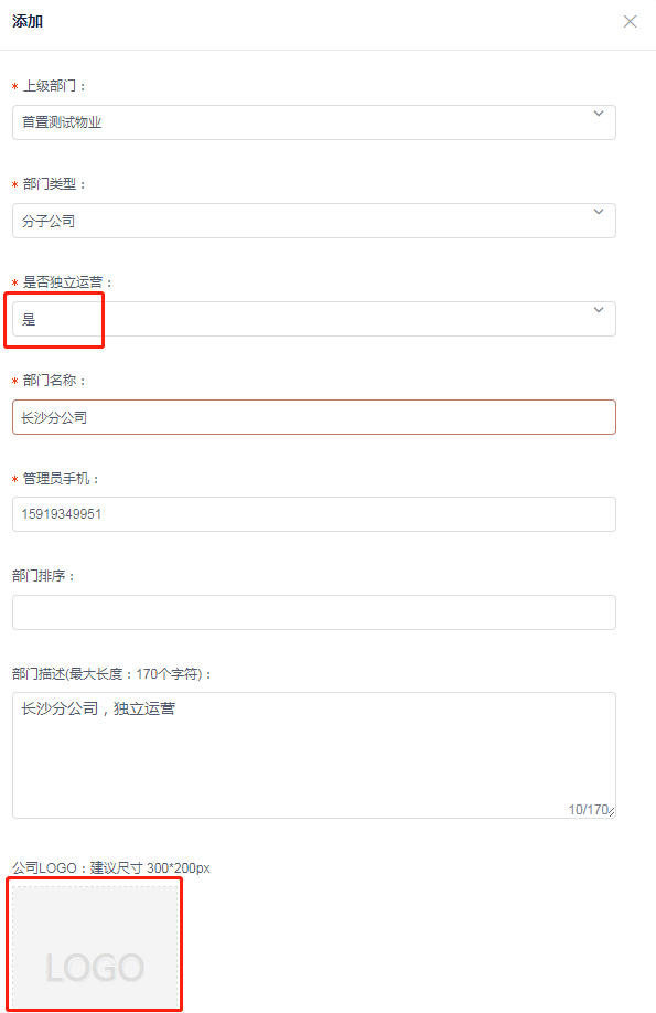 3.是否独立运营选项选择“是”,并正确填写其他部门信息后,点击**保存**按钮
