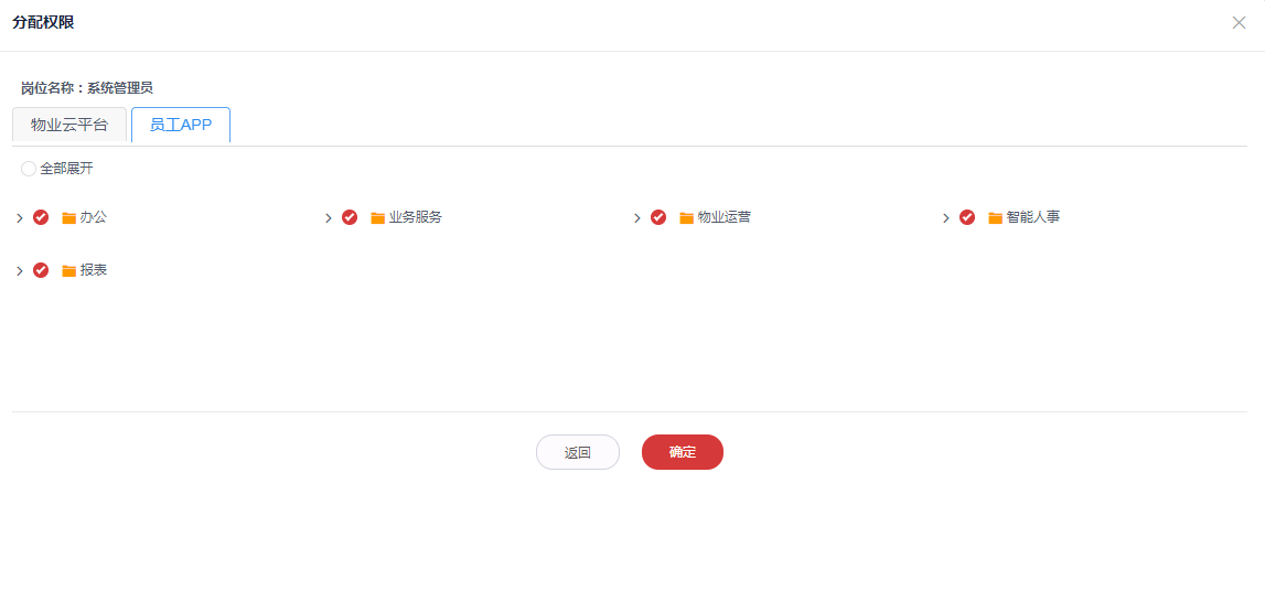 4.勾选上所需要分配的物业云平台或员工app权限后点击**确定**按钮即分配权限成功
