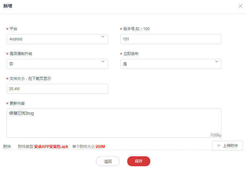 6. 填写必填字段并上传APK包后点击**保存**按钮(只有Android需要上传APK包)