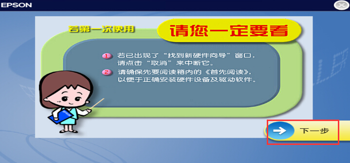 1. 把打印机的USB连接线连接电脑、电源线连接至电源插座后,务必先保持关机,安装打印机驱动通过点击EPSETUP来自动安装