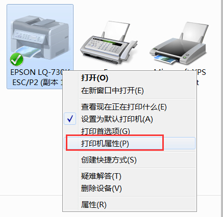 4. 打印机设置中确保,LQ-730K打印机处于选中状态,点击右键,选择“设置为默认打印机”