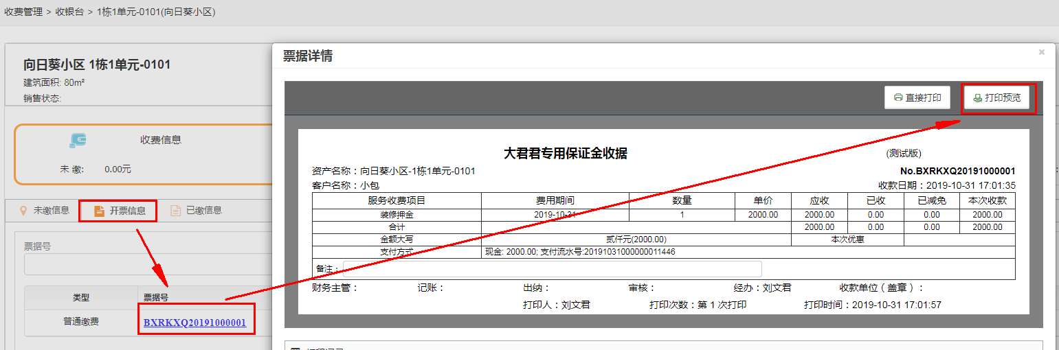 2.点击界面蓝色票据号字样,进入到票据详情查看界面,点击打印预览按钮