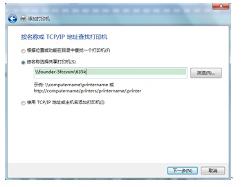 2.3 选择“按名称选择打印机”,输入“\\主机端计算机名\共享打印机名”,进行下一步。注:输入的计算名和打印机共享名不需要区分大小写。
