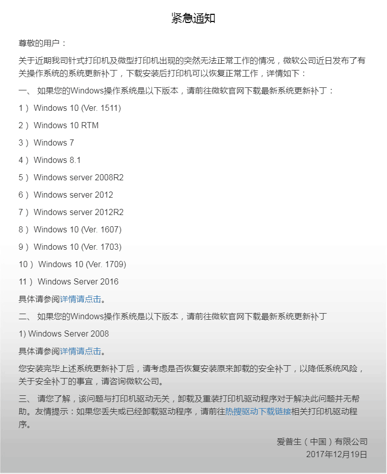 - 爱普生部分型号打印机失效问题