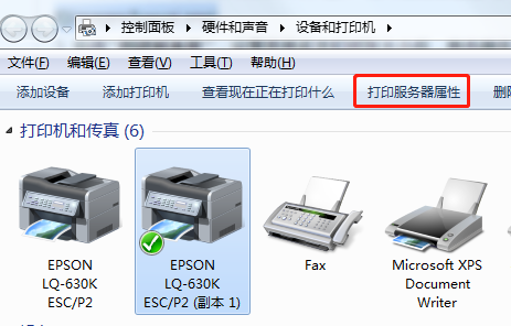 2. 右键选中打印票据的针式打印机,选择**打印服务器属性**。