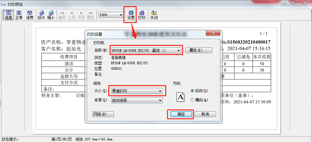 5. 单击设置,在打印设置页面,选择已配置过的打印机和纸张大小后,单击确定即可。在这里进行了第一次设置后,后续打印将默认按此纸张大小打印,无需再次配置。