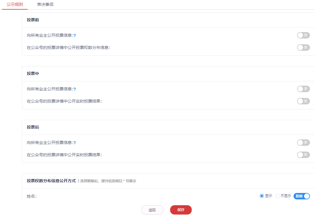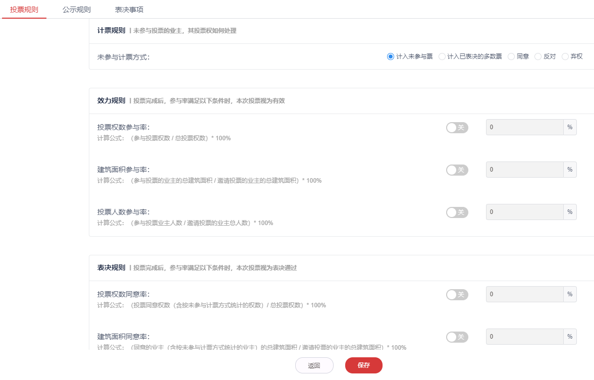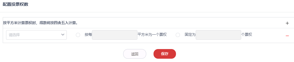 * 自定义投票权数。当勾选自定义投票权数时,可以配置不同的房产类型,按面积或固定权数来折算票权。