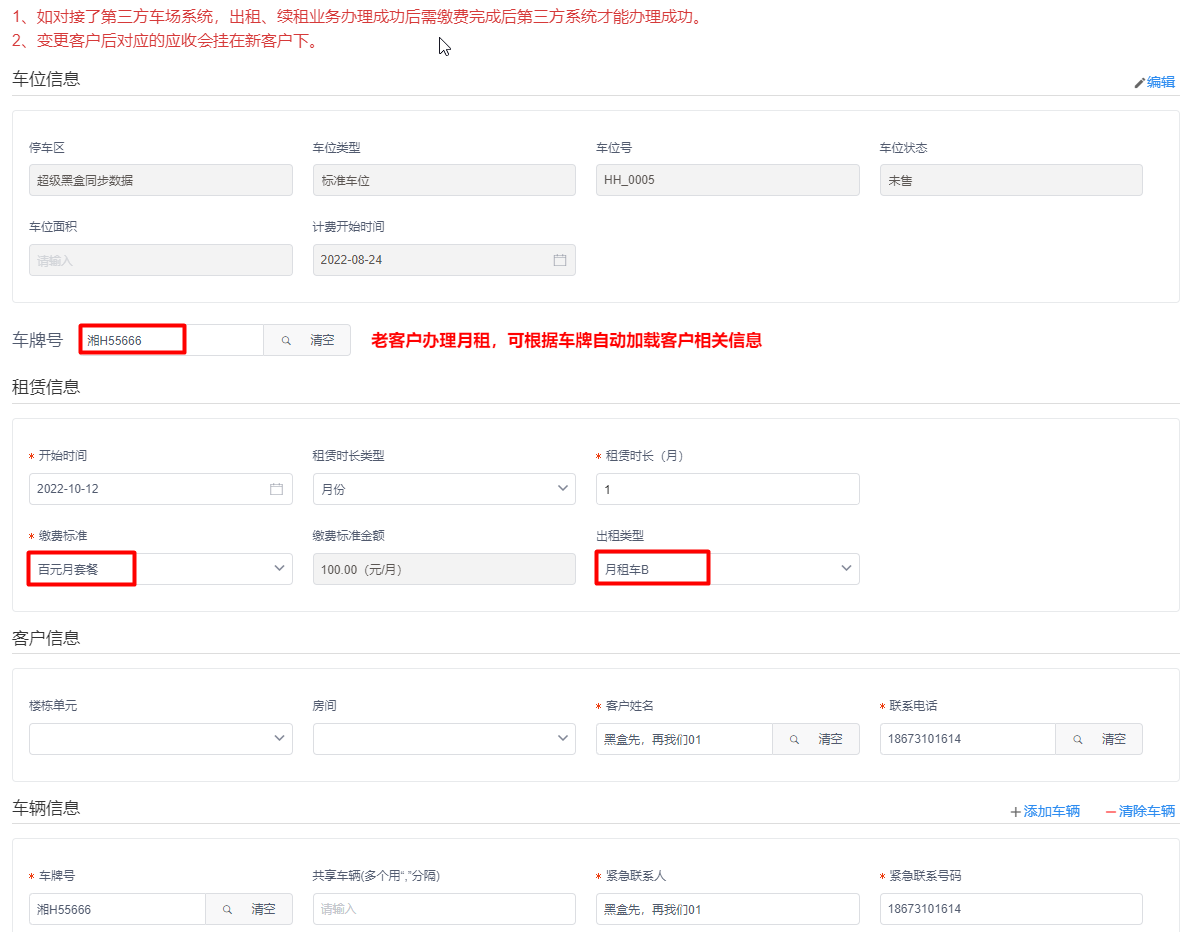 对接超级黑盒的车场,车位既可以办理产权登记,也可以办理月租业务。当办理月租业务时,车辆信息必填。