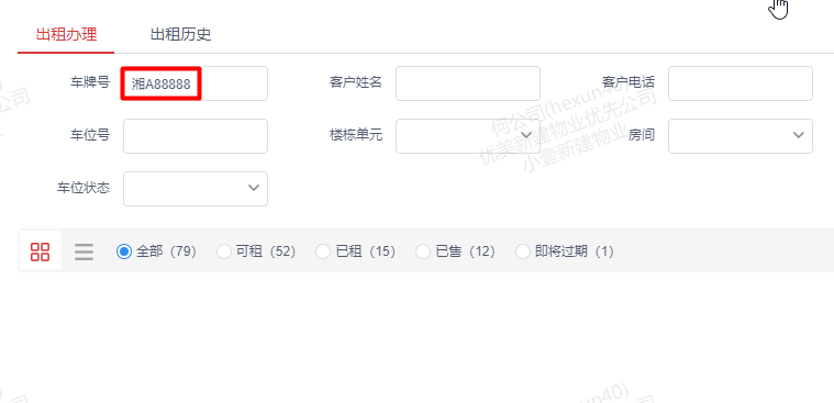 2、同一个车牌不能办理多个车位出租,请先输入车牌,确定没有出租记录(如下所示,输入车牌后,下面没有搜索出数据即表示没有出租数据)。