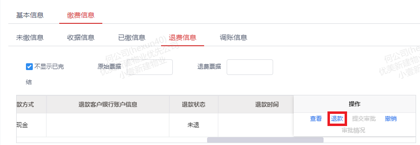3、选择退费信息,点击**退款**(请一定不要点击**撤销**)。