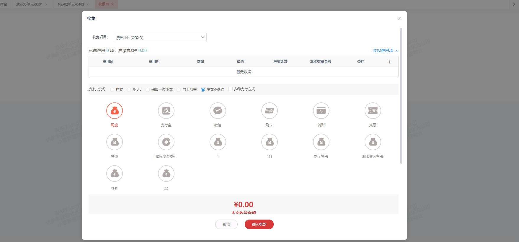 1.点击菜单:**物业管理 > 物业收费 > 费用收取 > 收银台** 。