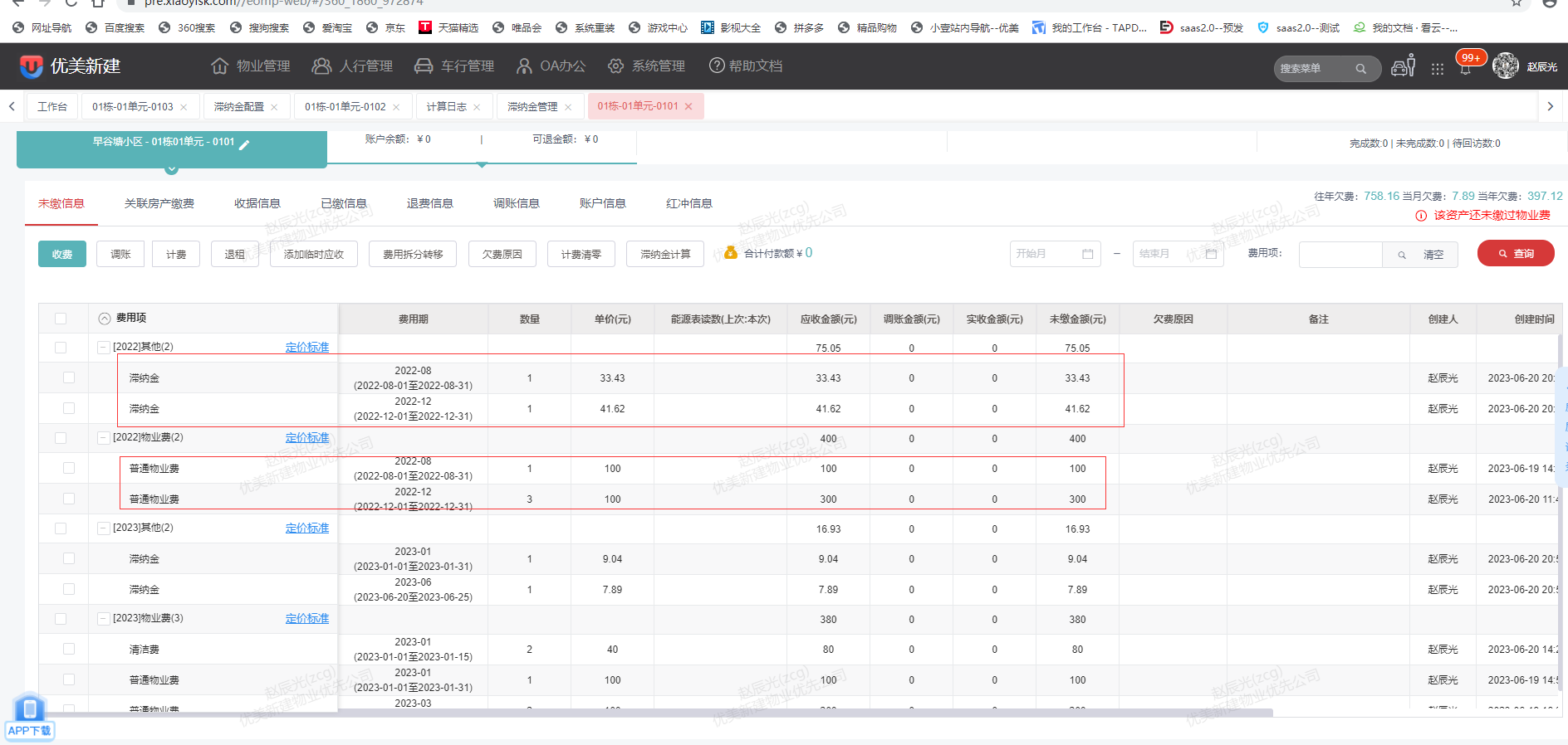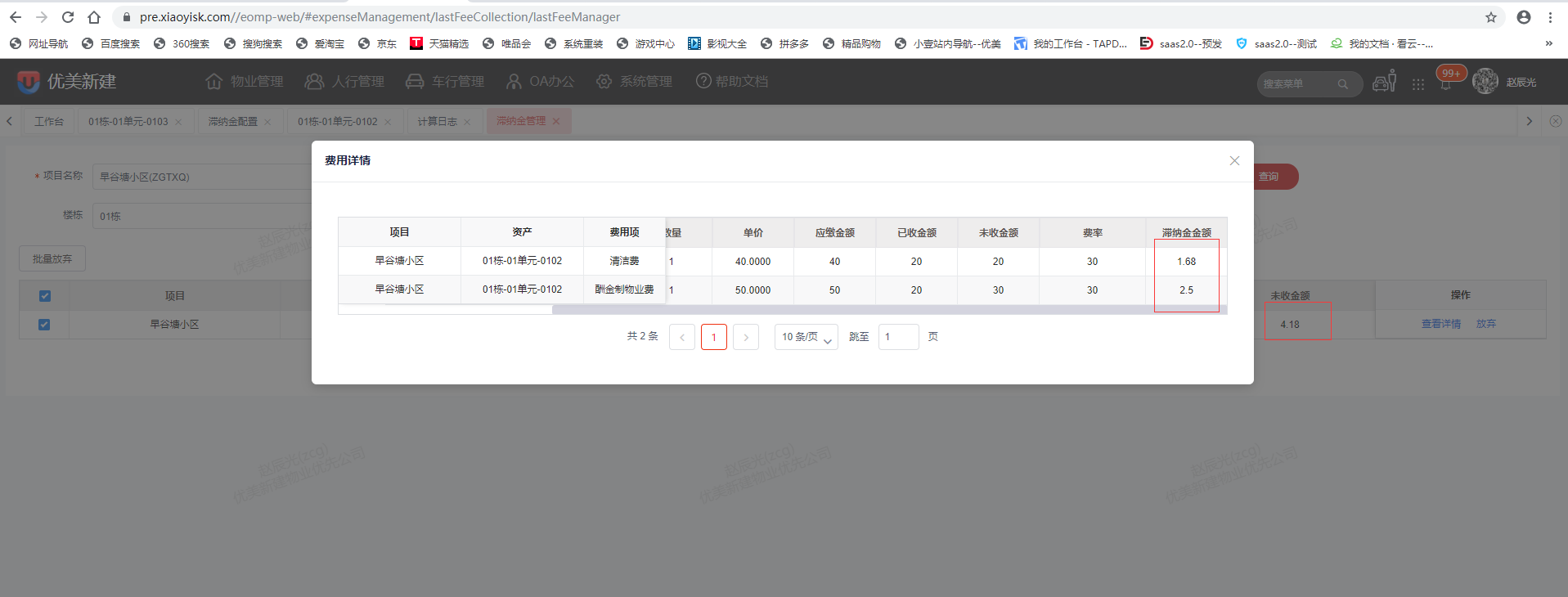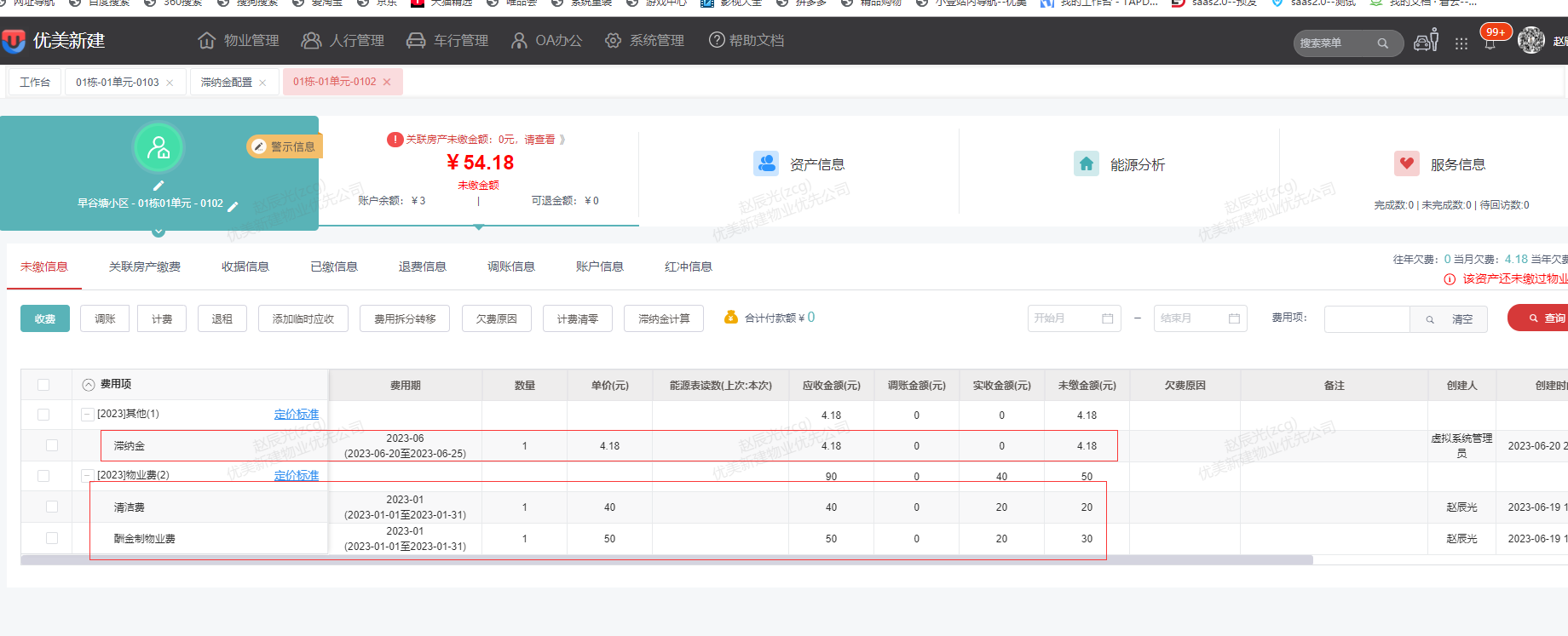 * 房屋下多个费用都生成滞纳金,但在360界面只一条滞纳金费用金额为所有费用产生的滞纳金总和,费用期为当前月份,具体费用产生了多少滞纳金可以通过滞纳金管理和计算日志查看。