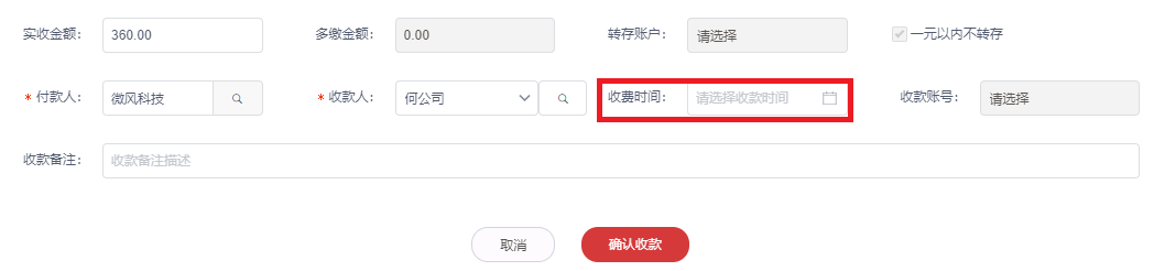4. 收费时间默认为当前时间,物业员工可以修改。检查信息无误后,点击确认收款按钮。