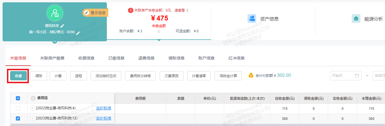 2. 在**未缴信息**列表界面选择需要缴物业费的记录,点击**收费**按钮(可通过欠费时间段快速查询);