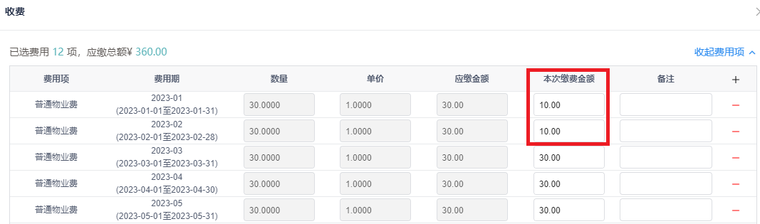 3. (可选)如某一个周期并不是全额缴费,在收费界面,点击展开费用项,可修改本次缴费金额为实际支付金额。