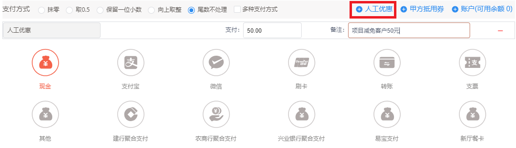 5. (可选)如需要给客户优惠更多金额,点击人工优惠,输入优惠金额和备注。