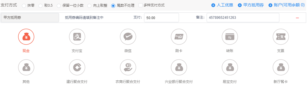 5. (可选)如客户使用甲方抵用券缴纳费用,点击甲方优惠券,输入优惠金额和备注。