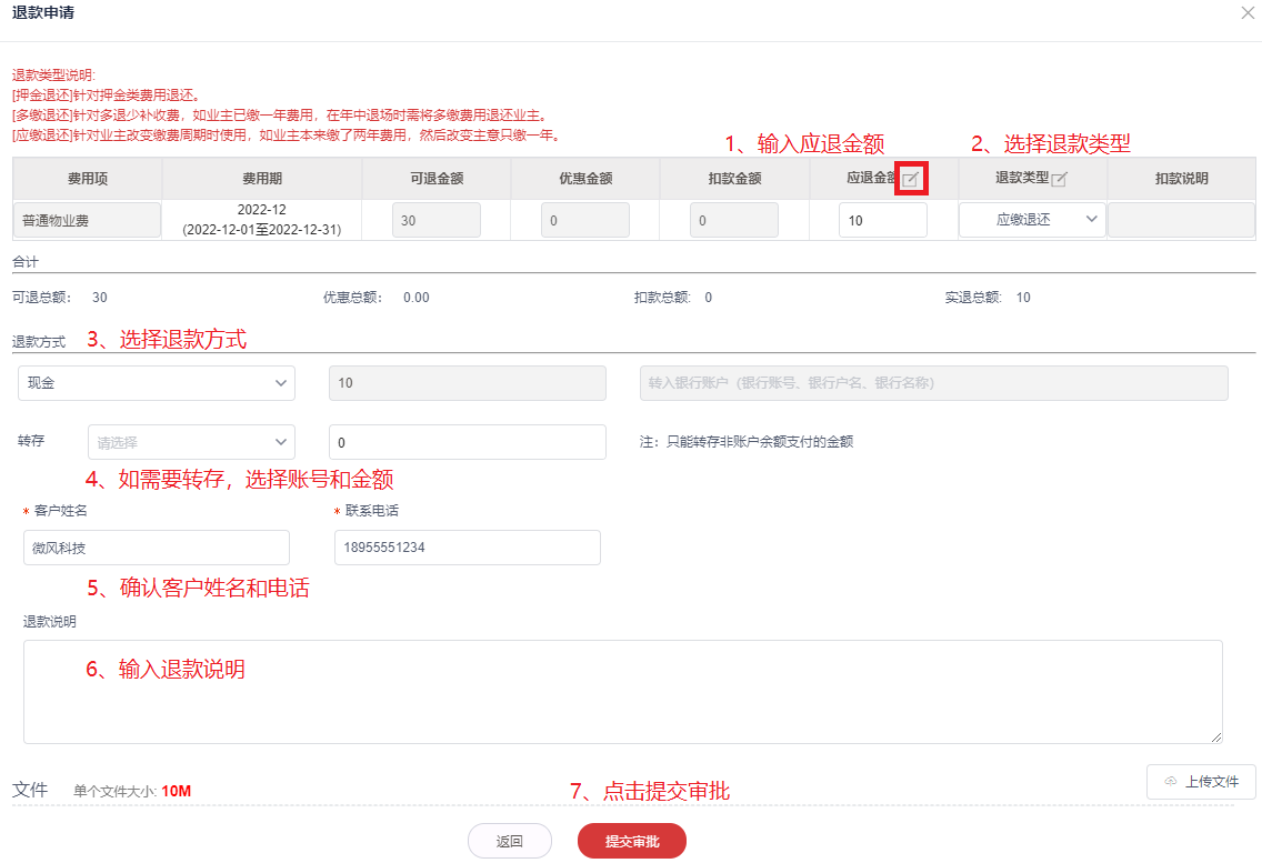 3.填写应退金额,选择退款类型,输入客户退费信息,点击提交审批按钮。