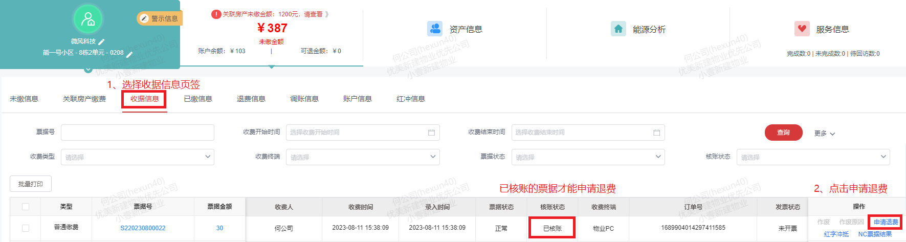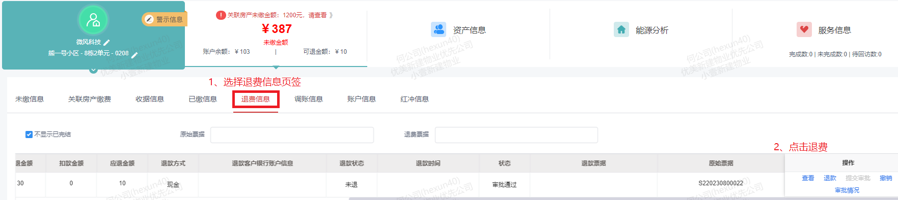 [应缴退还]针对业主改变缴费周期时使用,如业主本来缴了两年费用,然后改变主意只缴一年。应缴退还后,费用仍然会在未缴信息页签展示出来。