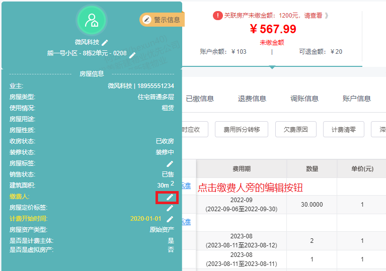 当房产下有多个住户时,可以设置默认的缴费人。设置缴费人后,费用产生时默认挂在缴费人名下的有:计费、服务产生的费用、装修管理、抄表等。