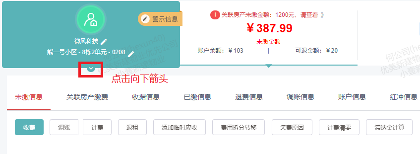2. 点击未缴信息界面客户信息的下拉箭头。